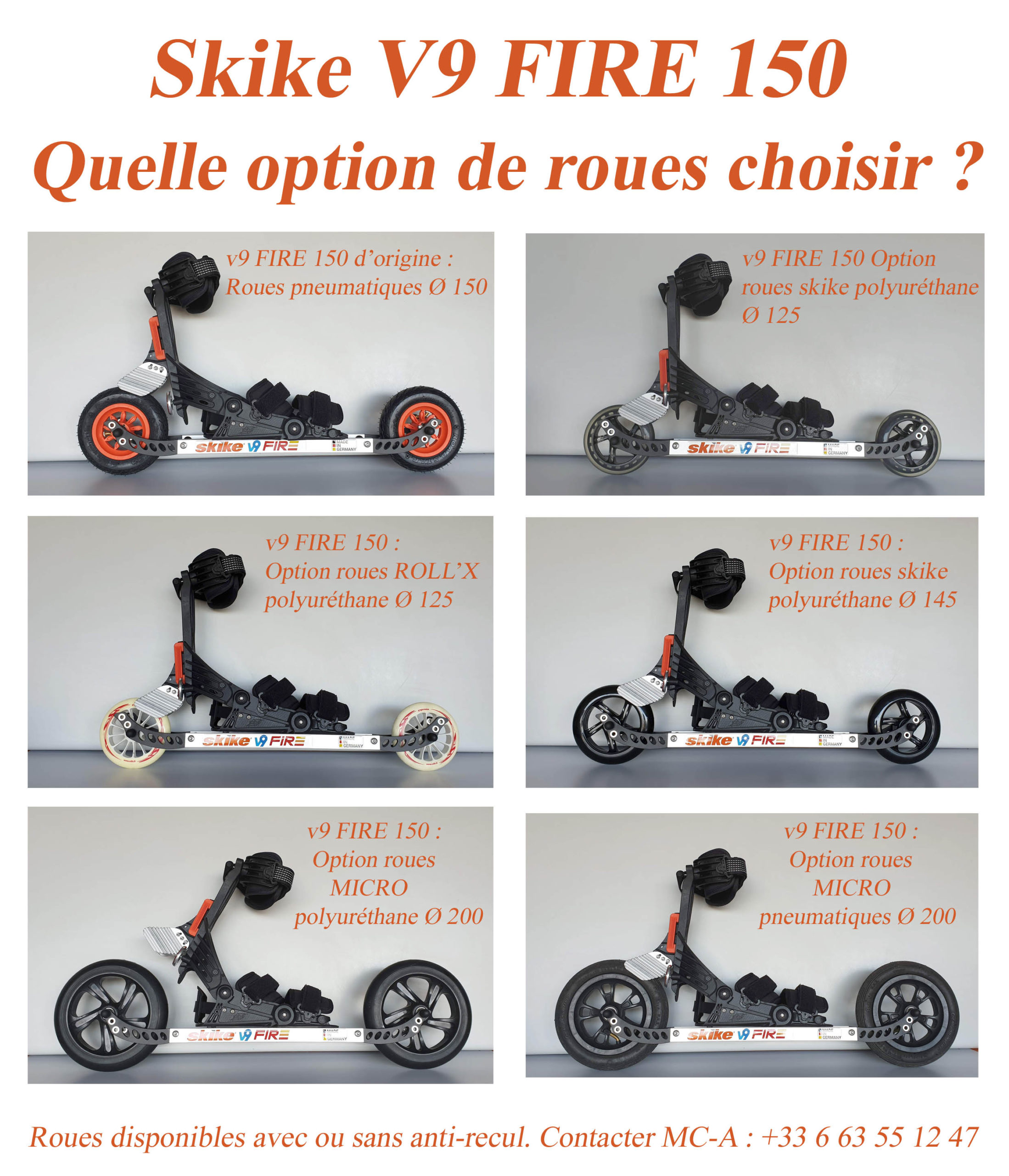 Il est possible de remplacer les roues pneumatiques par des roues polyuréthane skike de diamètre 125 ou 145 ou 160 mm. Dans ce cas, il n’y aura pas d’anti-recul et il ne sera possible de rouler que sur du goudron en bon état. C’est alors une alternative au vrai ski à roulettes mais avec des freins !